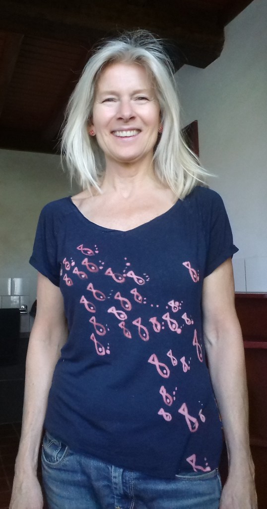 Ontzettend leuk om eens met andere materialen aan de slag te gaan. Dit was een erg saai t shirt. Met een kwastje bewerkt.