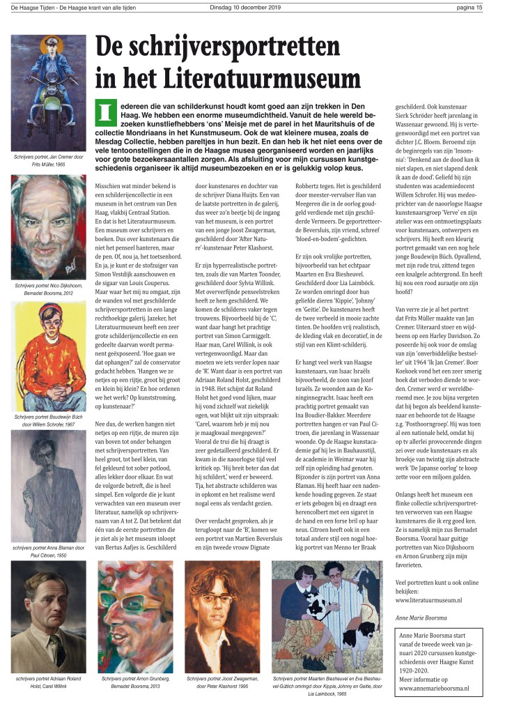 Kunsthistorica Anne Marie Boorsma (en jazeker, dat is tevens mijn zus) schreef een artikel in “De Haagse krant van alle tijden” van 10 december 2019 over het Literatuurmuseum. Ze schrijft met name over de schrijversportretten. Het is zeer boeiend om te lezen en het maakt je enthousiast om eens een kijkje te gaan nemen in het Literatuurmuseum om al die grote, kleine, felle, sobere, sombere en komische portretten van schrijvers te bekijken.