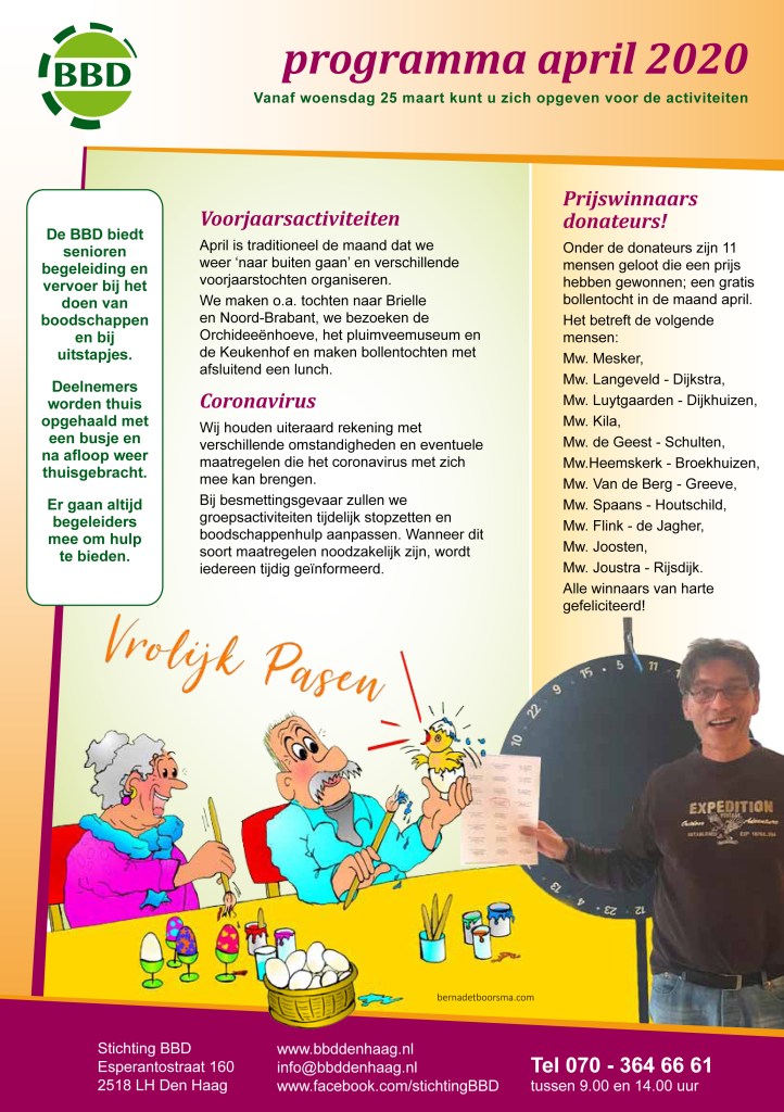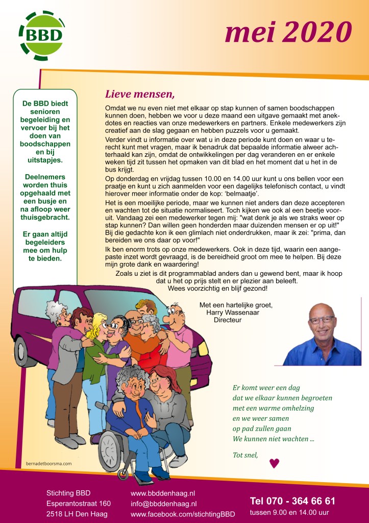 Zie hieronder hoe mijn illustraties Zijn verwerkt in het programmablad van de BBD Den Haag. Deze keer geen gezamelijke activiteiten helaas. Iedereen weet inmiddels wel waarom. In het programma van mei een illustratie van de ‘knuffelinhaalslag’ die bij de BBD gemaakt gaat worden als de coronacrises is afgelopen :-).