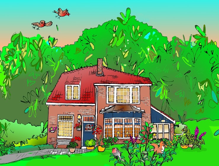 Hieronder mijn tekening n.a.v. een opdracht. De opdrachtgever wilde een poster laten maken voor haar ouders in de stijl zoals ik de tekeningen voor de BBD Den Haag maak. De opdracht was het (geweldig mooie) huis van de ouders weer te geven.